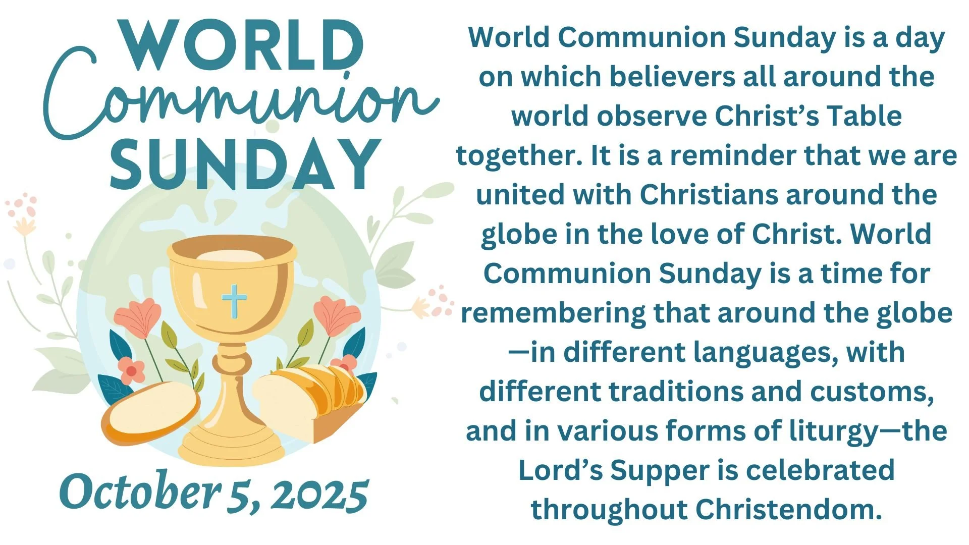 Oct 5 11:00 AM11:00 World Communion Sunday Sunday, October 5, 2025 11:00 AM 12:00 PM 11:00 12:00 Google Calendar ICS View Event →