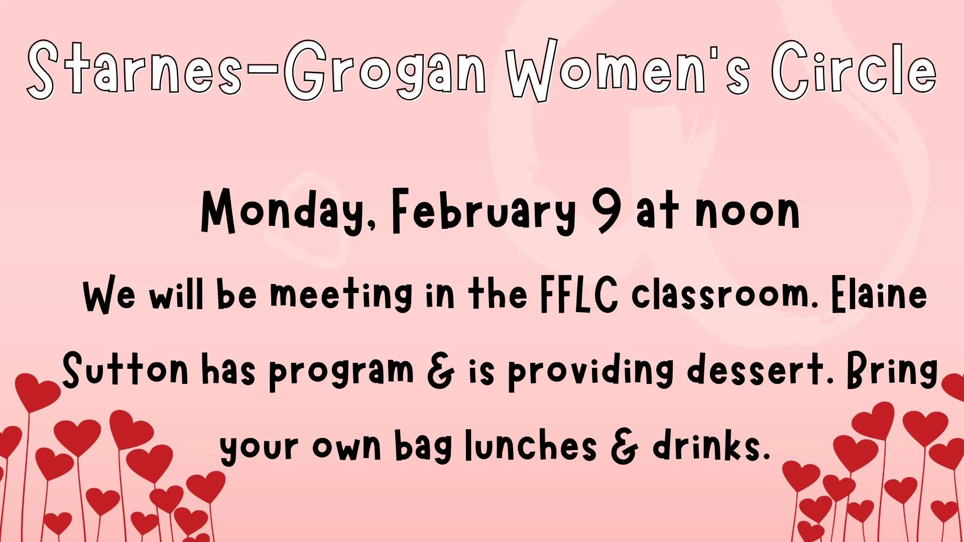 Feb 9 12:00 PM12:00 Starnes-Grogan Women's Circle Monday, February 9, 2026 12:00 PM 1:00 PM 12:00 13:00 Google Calendar ICS View Event →