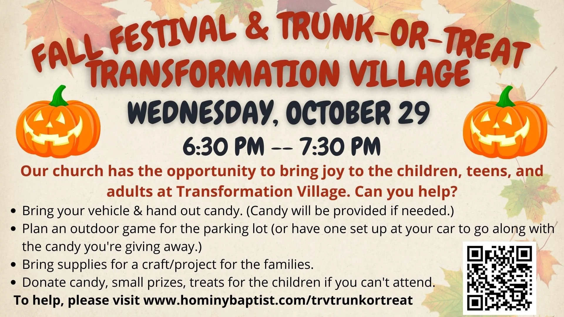 Oct 29 6:30 PM18:30 Fall Festival and Trunk-Or-Treat at Transformation Village Wednesday, October 29, 2025 6:30 PM 7:30 PM 18:30 19:30 Google Calendar ICS View Event →