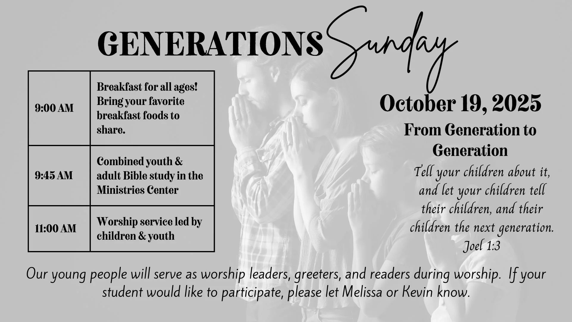 Oct 19 9:00 AM09:00 Generations Sunday Sunday, October 19, 2025 9:00 AM 12:00 PM 09:00 12:00 Google Calendar ICS View Event →