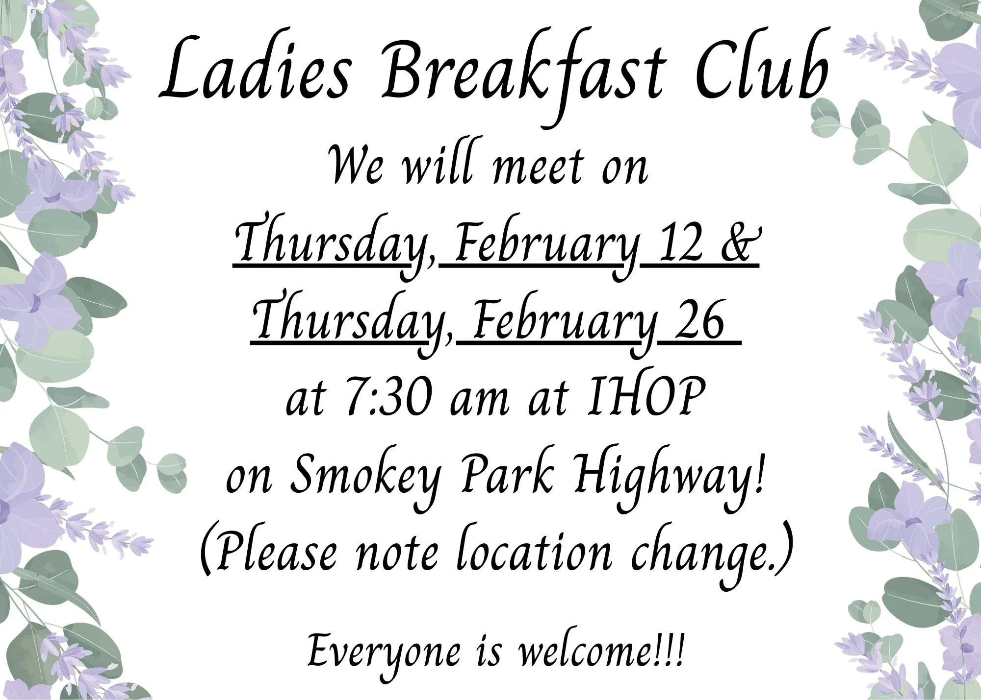 Feb 12 7:30 AM07:30 Ladies Breakfast Club Thursday, February 12, 2026 7:30 AM 8:30 AM 07:30 08:30 Google Calendar ICS View Event →
